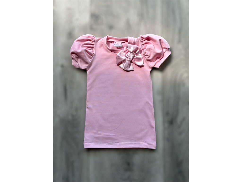 Roztomilé dievčenské tričko v jemnej ružovej farbe je ideálnou voľbou na každodenné nosenie aj špeciálne príležitosti. Elegantná saténová mašľa na prednej strane dodáva tričku nežný a štýlový vzhľad.